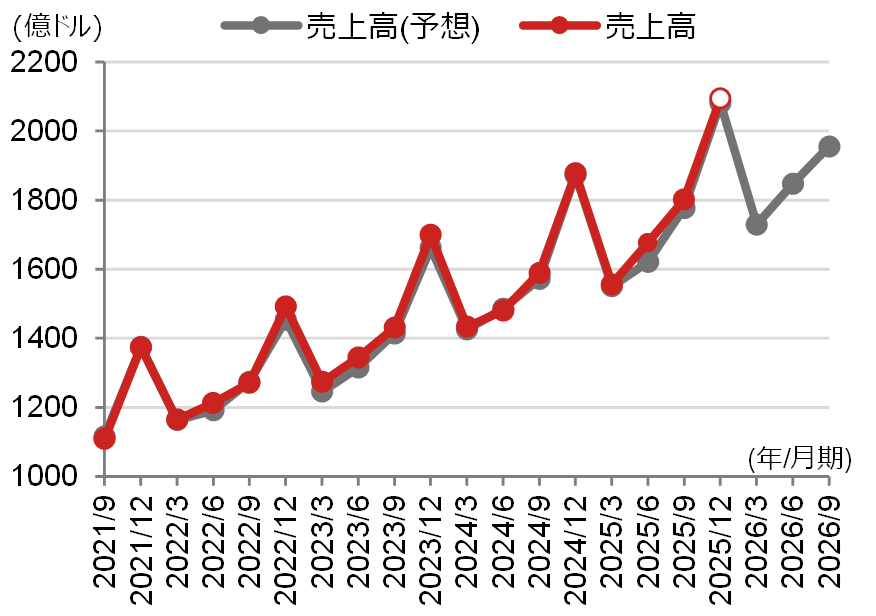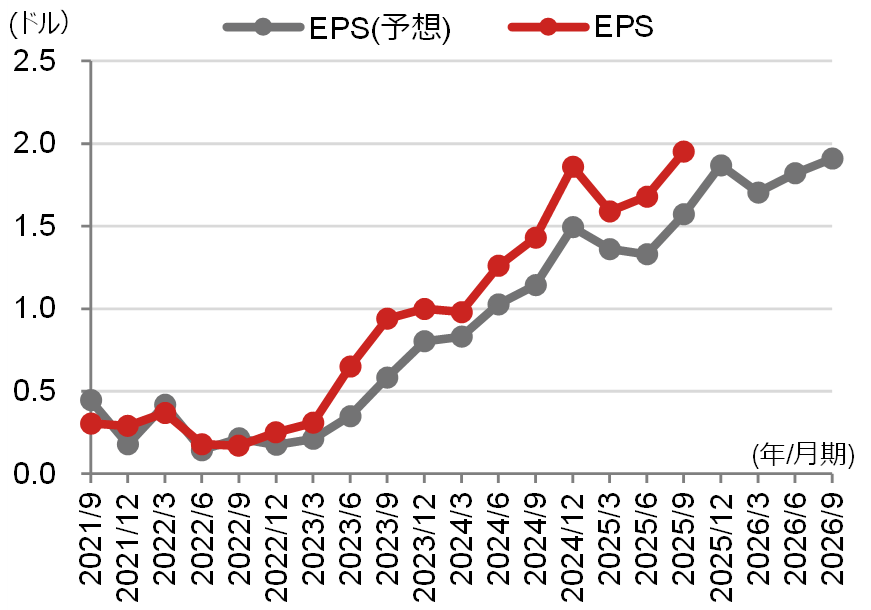 (注3)売上高とEPSの推移:赤色は実績で、直近値は2025年7-9月期(2025/9)。2025年10-12月期の売上高の白丸は会社見通し中間値。灰色はLSEG集計による市場予想平均。2025年10-12月期以降の予想は2025年10月29日時点。