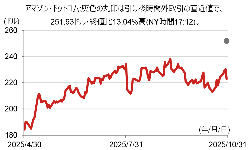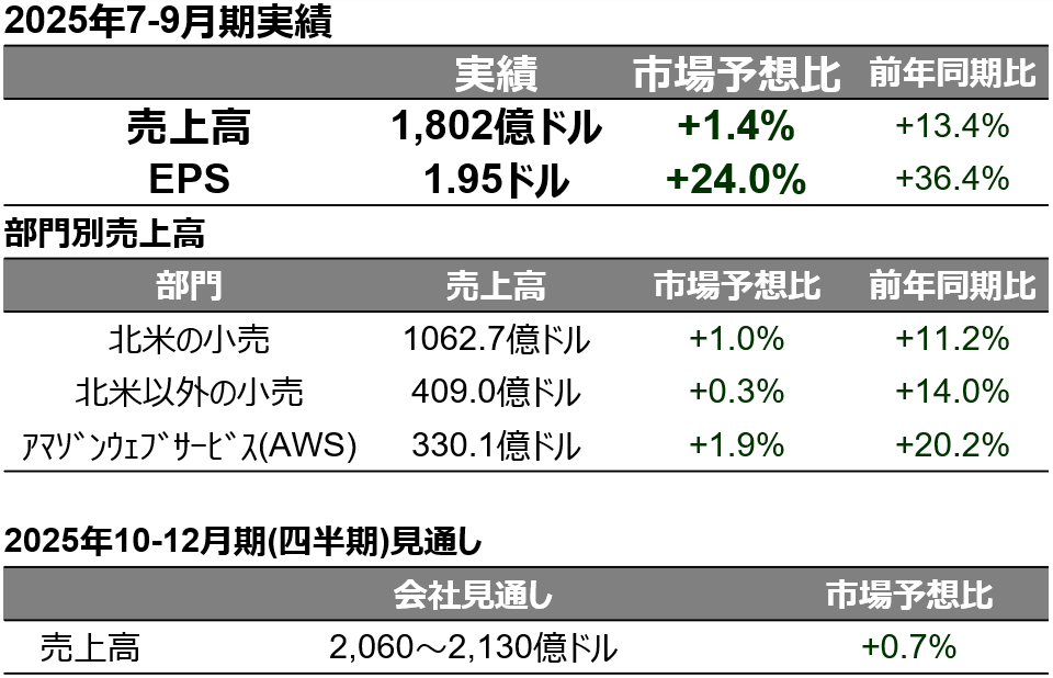 米国時間10月30日引け後に、イーコマースやメディアサービス、AI・クラウド事業のAWS(アマゾン・ウェブ・サービス)などを運営するアマゾン・ドットコム(AMZN US)が2025年7-9月期(2025.12期第3四半期)決算を発表しました。売上高は市場予想を1.4%上回り、EPSは市場予想を24.0%上回りました。