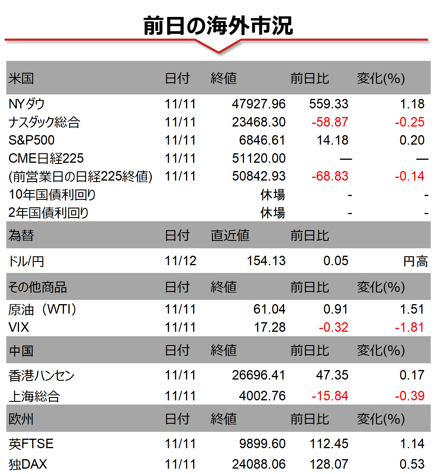 注)データは日本時間2025年11月12日午前7時半頃、QUICKより取得。ただしドル円相場の前日の数値は日銀公表値で、東京市場、取引時間ベース。CME日経平均先物は、中心限月。チャートは日次終値ベースですが、直近値は終値ではない場合があります。