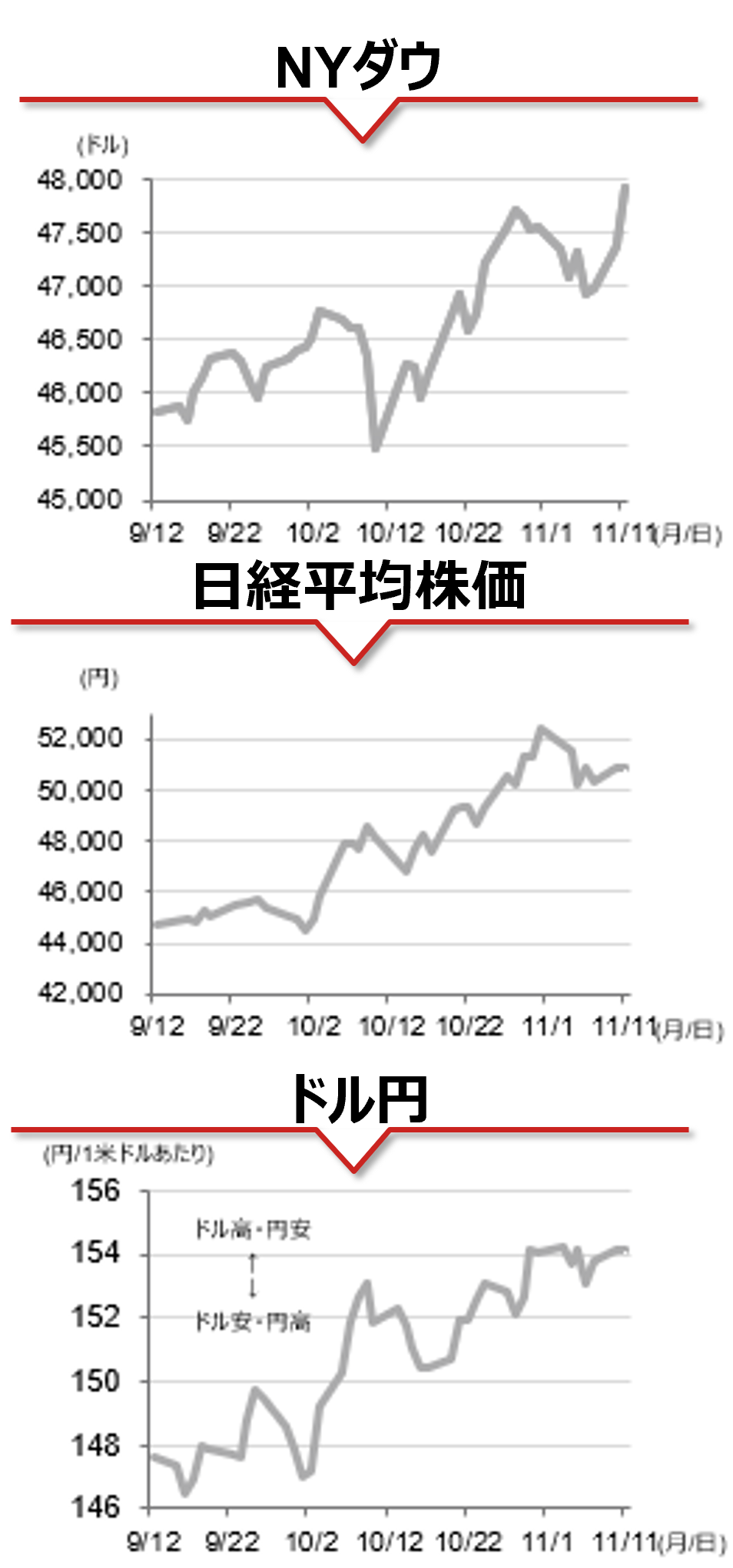 11月11日の米国株式市場では、NYダウは史上最高値を更新した一方、テクノロジー株比率の高いナスダック総合が反落しました。米国の政府機関閉鎖が終了し、経済活動が正常化するとの期待が相場を下支えしました。米上院が26年1月30日までのつなぎ予算案を10日に可決、米下院は12日にも採決を行い、トランプ大統領の署名を経て成立する公算です。週内には政府閉鎖解除の目途が立つとみられており、米国史上最長を記録した政府機関閉鎖に終わりが見えてきました。他方、11日発表のADPによる週次の米民間企業の雇用統計は、10月後半の労働市場の減速を示唆する内容でした。米労働市場の悪化を懸念して外国為替市場ではドルが売られる展開となり、円は一時1ドル=154円割れとなりました。個別では、ソフトバンクグループが保有する全株式を売却したと伝わったエヌビディアの株価が下落しました。