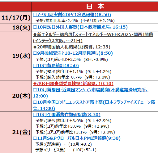 日本では17日(月)に7-9月期の実質GDP(1次速報値)が発表されるほか、19日(水)には9月機械受注と10-12月期見通し、21日(金)には10月全国消費者物価指数、11月S&Pグローバル日本PMI速報値が発表されます。7-9月期の実質GDPの前期比年率成長率は、トランプ関税等の影響からマイナス成長が予想されています。ただし、10-12月期には反発すると見込まれ、日本経済に対する市場の見方を大きく下方修正させる要因にはならないと予想されます。