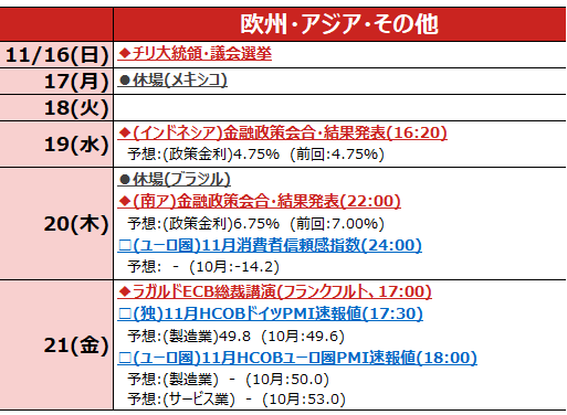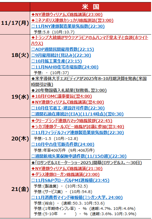 経済指標では政府閉鎖の影響を受けない、18日(火)の11月NAHB住宅市場指数、20日(木)の11月フィラデルフィア連銀製造業景気指数、21日(金)の11月S&PグローバルPMI速報値、11月ミシガン大学消費者マインド確報値などが注目を集めそうです。