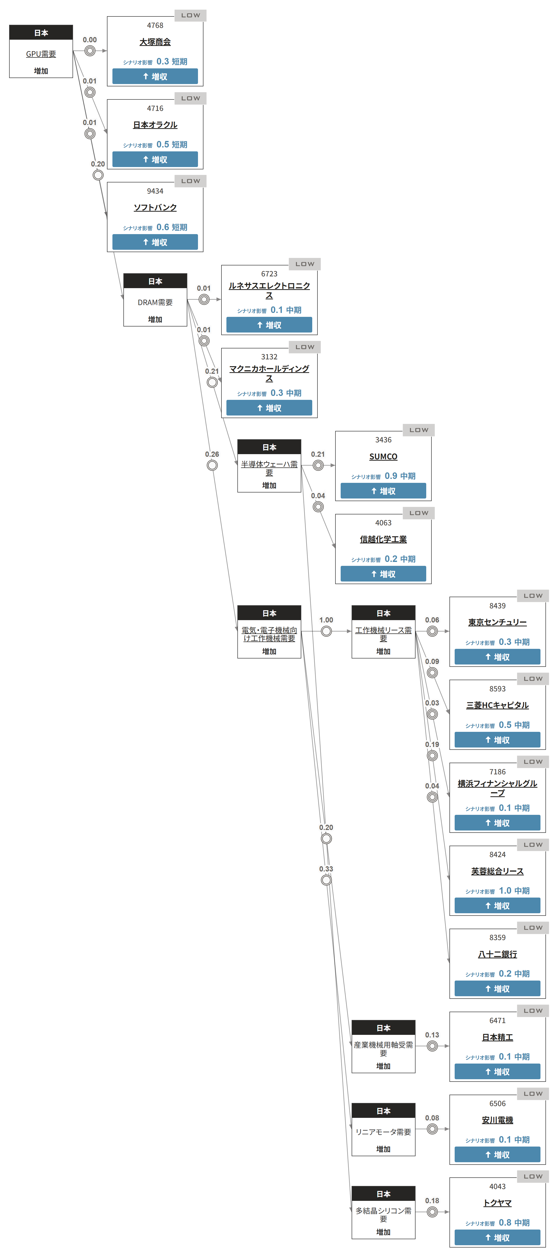 生成AIの利用拡大に伴いデータセンター投資が加速し、半導体需要の拡大につながっています。米国時間11月19日夕方に実施された米半導体大手エヌビディアの決算発表では、新型のAI・データセンター向け製品の需要が強く、クラウド用GPU(画像処理半導体)は「売り切れ」とのコメントがありました。AI「xenoBrain」は、「GPU需要増加」が他のシナリオにも波及する可能性を考慮し、影響が及ぶ可能性のある15銘柄を選出しました。