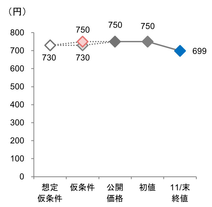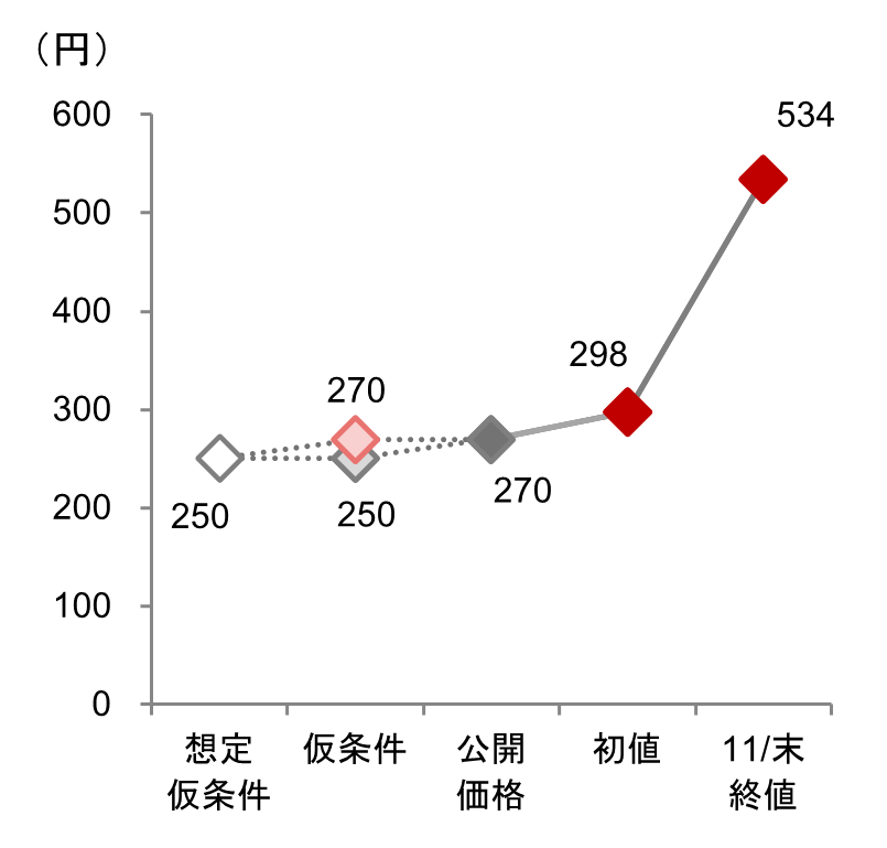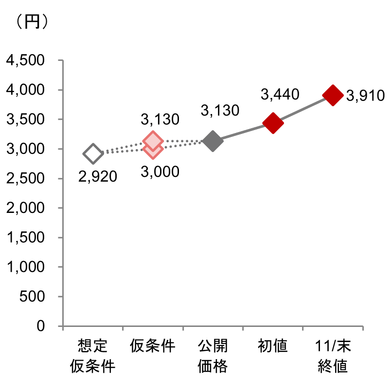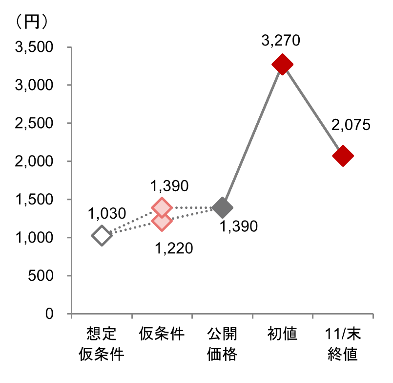 (注1)初値及び直近月末終値が公開価格に対して上回っているものは赤、下回っているものは青で表示。