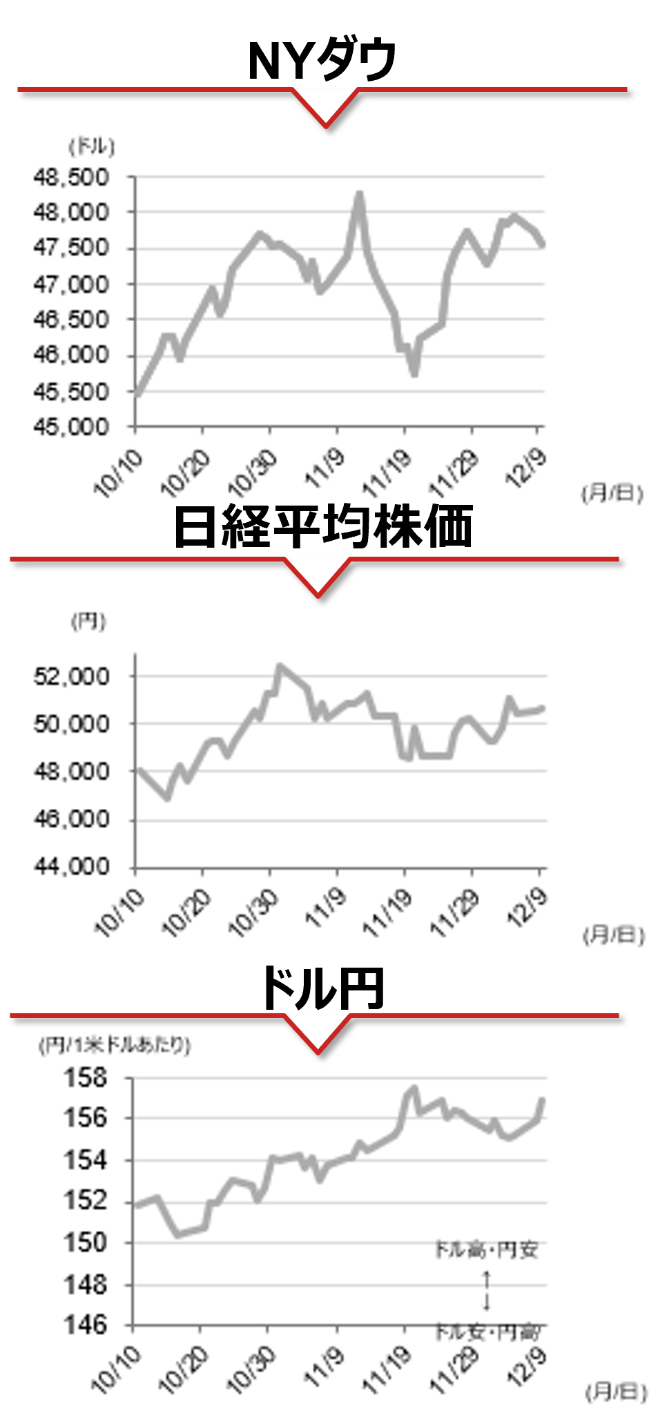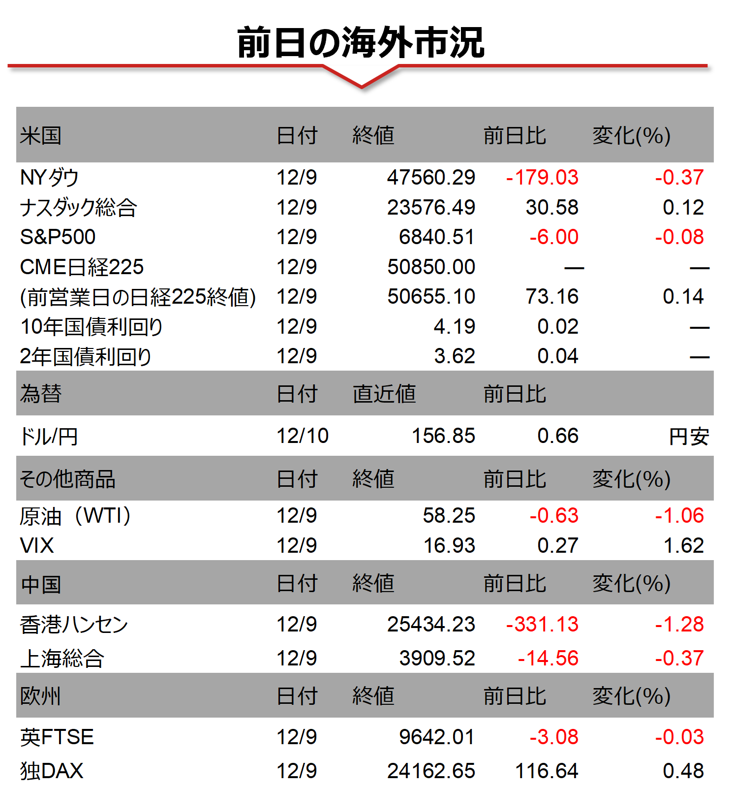 注)データは日本時間2025年12月10日午前7時半頃、QUICKより取得。ただしドル円相場の前日の数値は日銀公表値で、東京市場、取引時間ベース。CME日経平均先物は、中心限月。チャートは日次終値ベースですが、直近値は終値ではない場合があります。