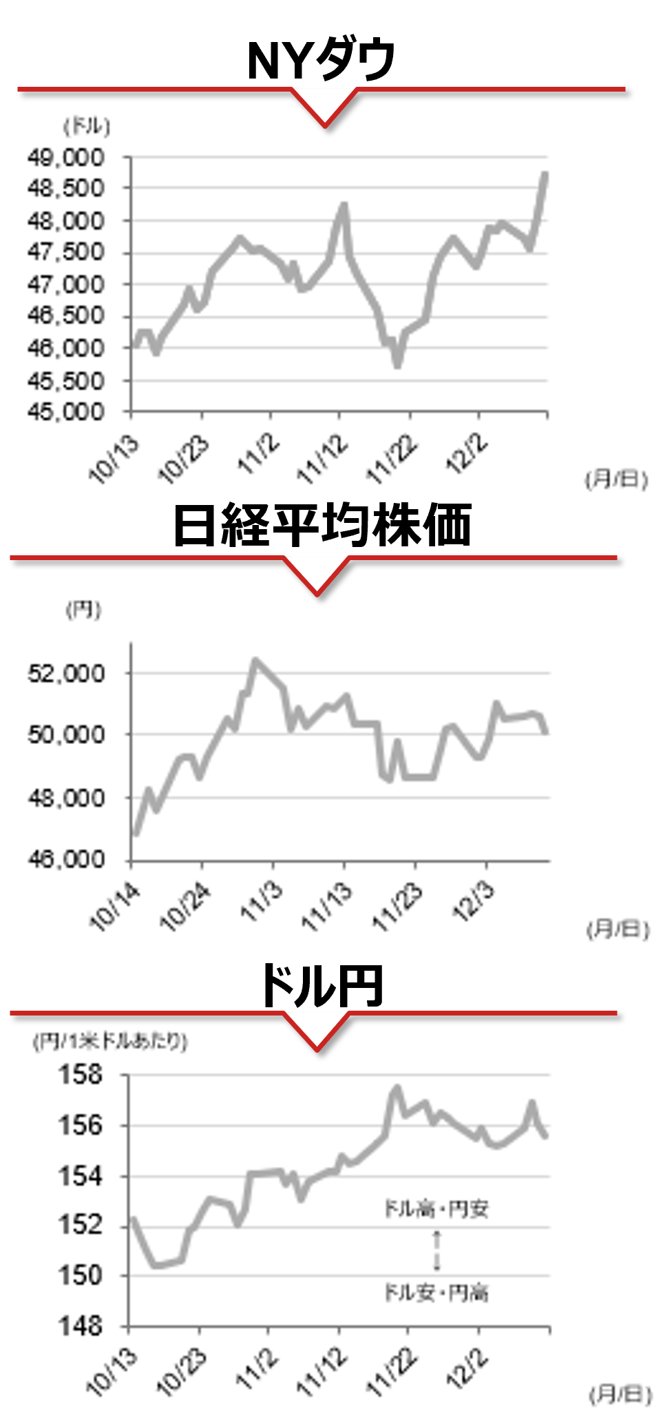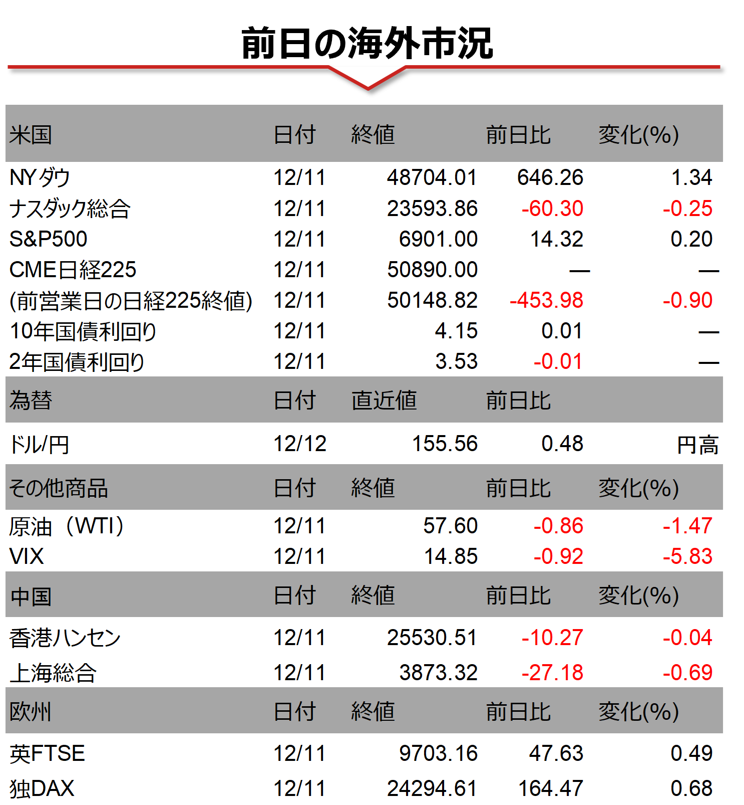 注)データは日本時間2025年12月12日午前7時半頃、QUICKより取得。ただしドル円相場の前日の数値は日銀公表値で、東京市場、取引時間ベース。CME日経平均先物は、中心限月。チャートは日次終値ベースですが、直近値は終値ではない場合があります。