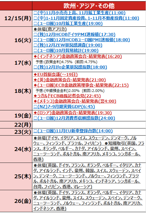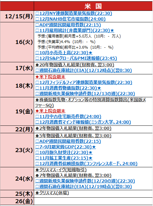 22日の週には世界的にクリスマス休暇モードに入り、市場参加者は大幅に減少することが見込まれます。2025年は、AI関連株を中心に世界的に株式市場が活況であったことから、収益の底上げを狙うような投機的な動きは生じ難いと予想されます。