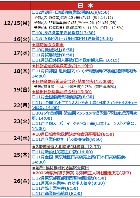 (注)イベントは全てを網羅している訳ではない。◆は政治・金融政策関連、□は経済指標、●はその他イベント(カッコ内は日本時間)。休場・短縮取引は主要な取引所のみ掲載。各種イベントおよび経済指標の市場予想(ブルームバーグ集計に基づく中央値)は2025年12月12日時点の情報に基づいており、今後変更される可能性もある。米国経済統計の★印は2025年10月1日から実施された米国政府機関の一部閉鎖の影響で公表が延期されていた経済指標。