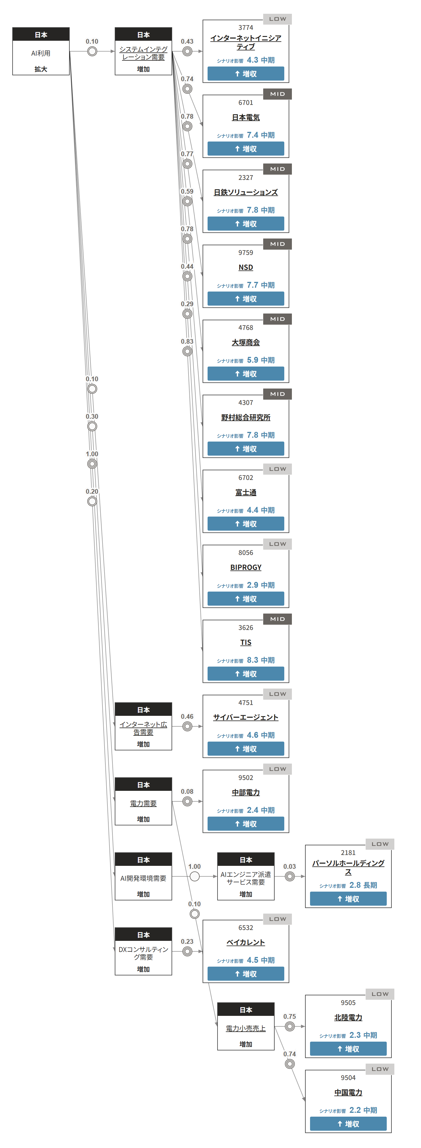 高市早苗首相は2025年12月19日に開催された人工知能戦略本部で、AIの開発や利活用に1兆円規模の投資を行う方針を示しました。国産の基盤モデルを構築し、ロボットや機械をAIで制御する「フィジカルAI」の開発につなげるとしています。AI「xenoBrain」は、「AI利用拡大」が他のシナリオにも波及する可能性を考慮し、影響が及ぶ可能性のある15銘柄を選出しました。