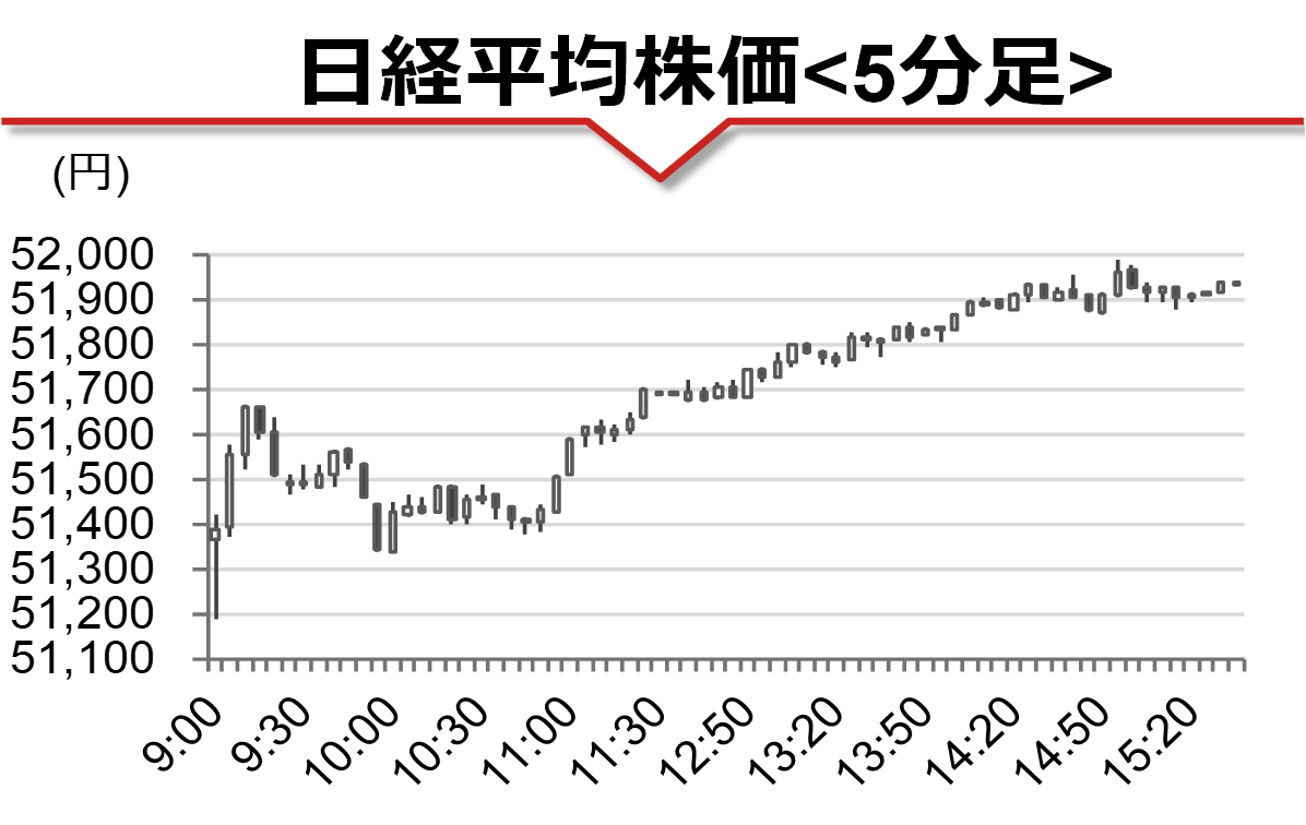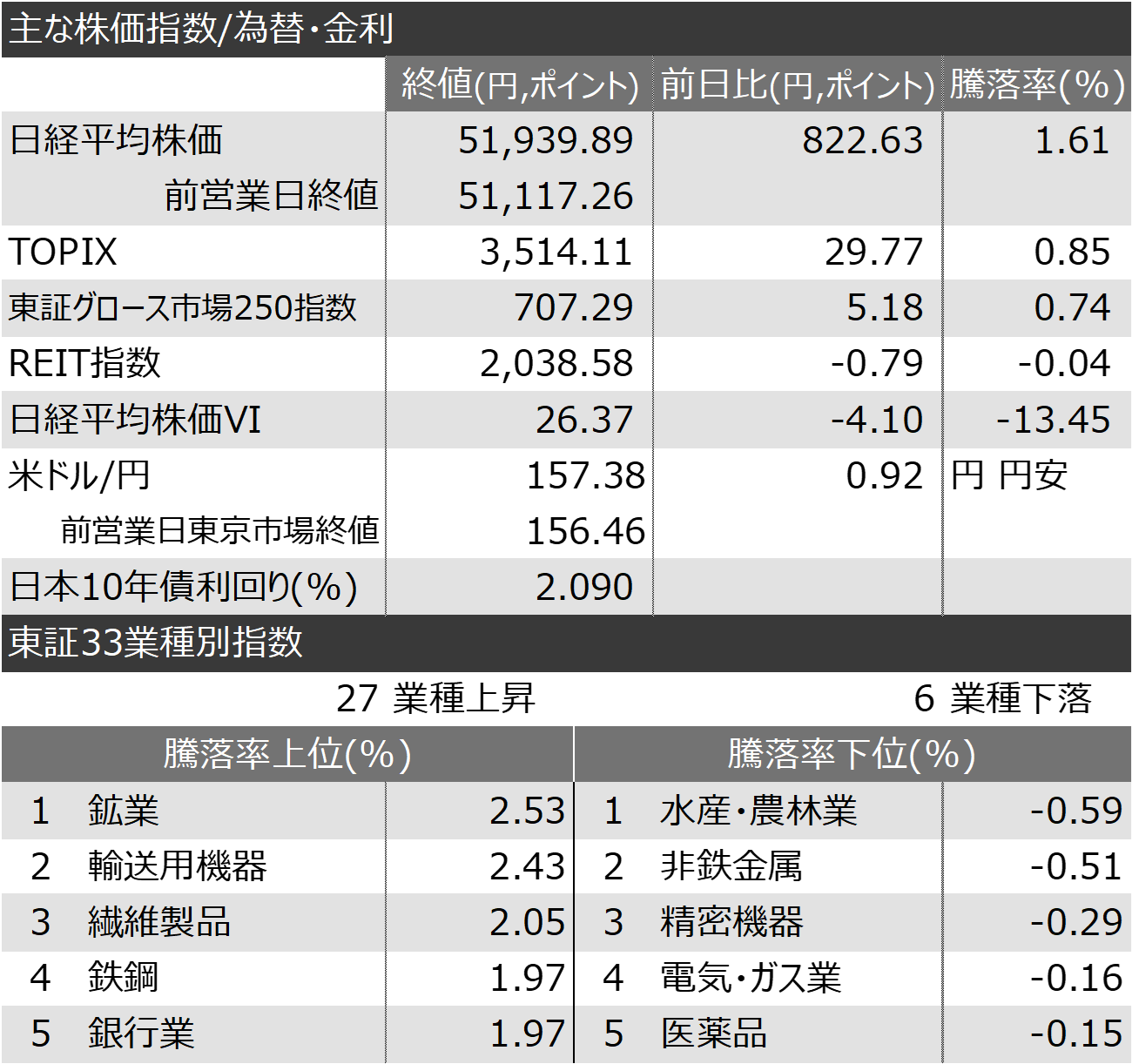 9日の日経平均株価は、半導体関連株の上昇に加え、値がさのファーストリテイリングが大幅高となったことで、上昇しました。中国政府が、2026年1-3月期中にエヌビディア製AI向け半導体「H200」の輸入を承認すると報じられ、日本の半導体関連株の上昇につながりました。また、前日引け後に好決算を発表したファーストリテイリングが日経平均株価の上昇をけん引しました。為替市場では、8日に米国労働市場の底堅さを示す経済指標が発表されたことで、FRBによる追加利下げ期待がやや後退し、米金利が上昇する中、米ドル円が157円台半ばまで円安が進行しました。円安米ドル高の進展を好感し、自動車や同部品株の上昇も目立ちました。日経平均株価は徐々に上げ幅を拡大させていき、終値は前日比822円高の51,939円で引けました。なお、ファーストリテイリングは前日比+10.67%で、1銘柄で日経平均株価を485円押し上げました。